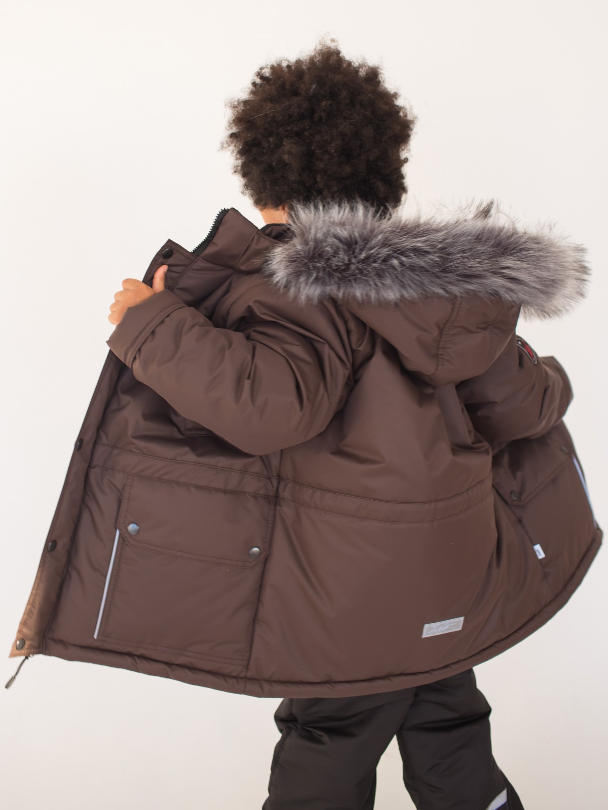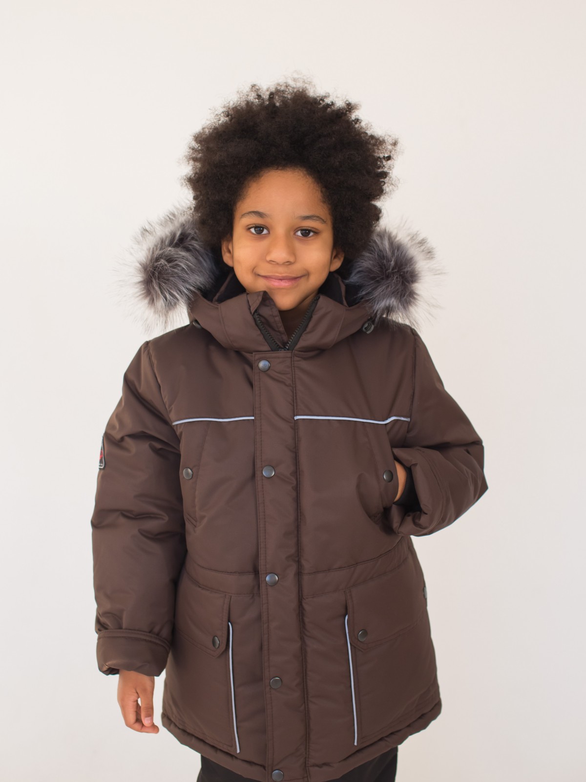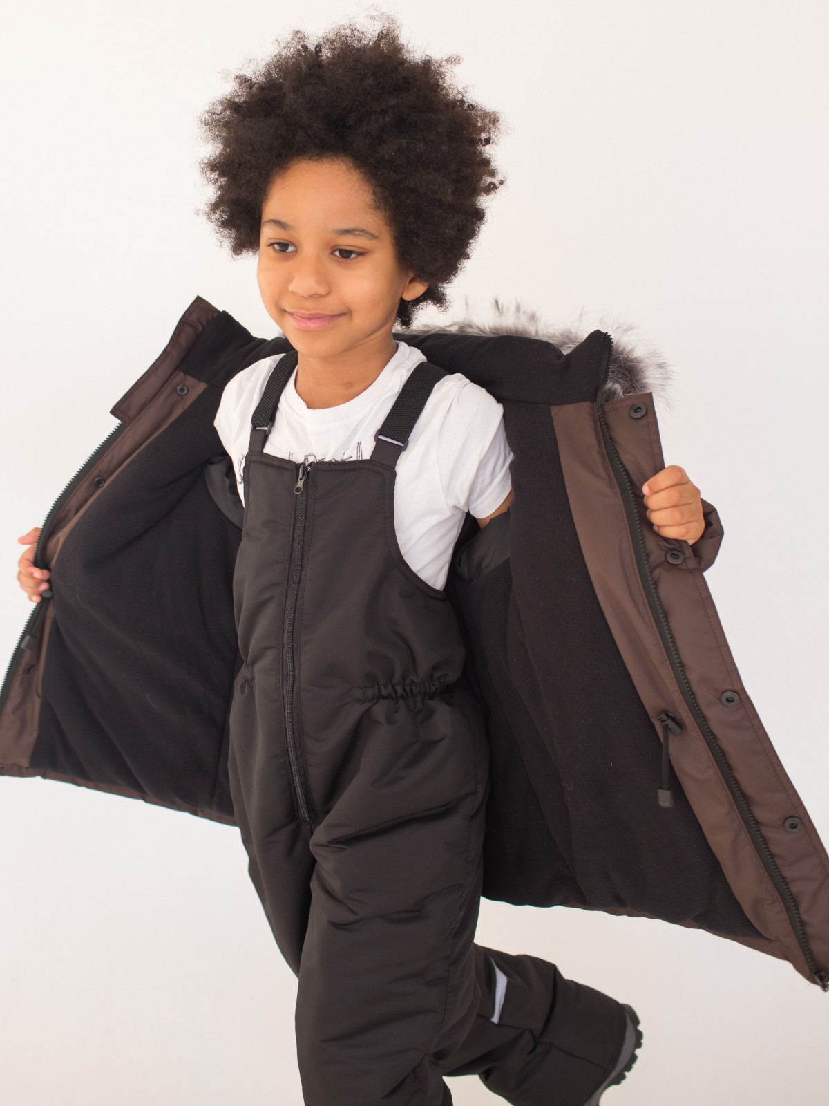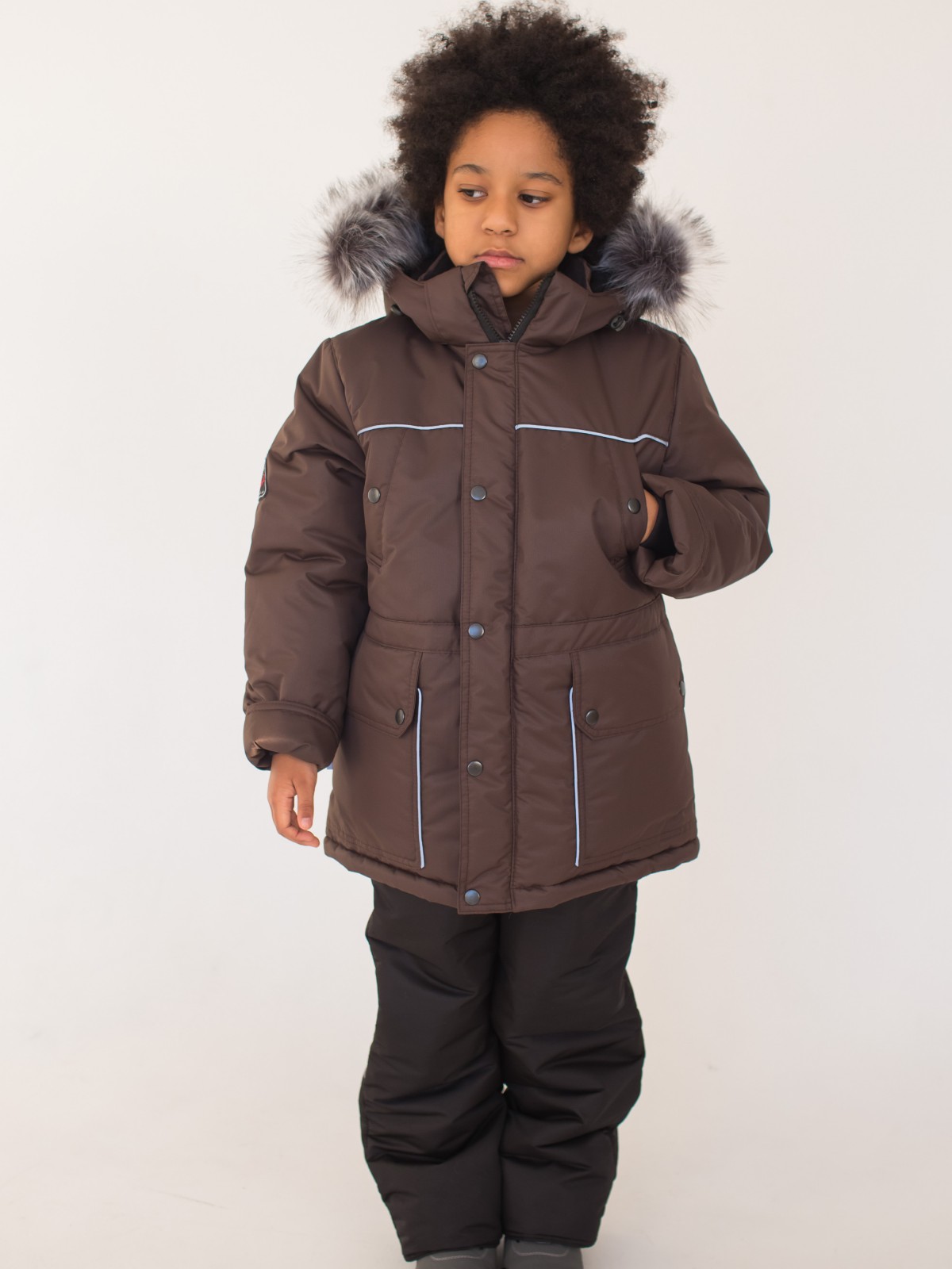 Зимний костюм, состоящий из удлиненной куртки и полукомбинезона – стильный, теплый и универсальный вариант верхней одежды для мальчиков от 2 до 7 лет. В костюме предусмотрены подвороты рукавов и штанин до 5-6 см, что актуально для тех, кто рассматривает покупку костюма более чем на 1 сезон. Дополнительные характеристики зимнего костюма: ветрозащитная планка под молнией; кулиска на талии; трикотажные манжеты внутри рукавов; плотная резинка внизу штанин; мех искусственный (съёмный, гипоаллергенный); съемный капюшон; светоотражающие элементы.